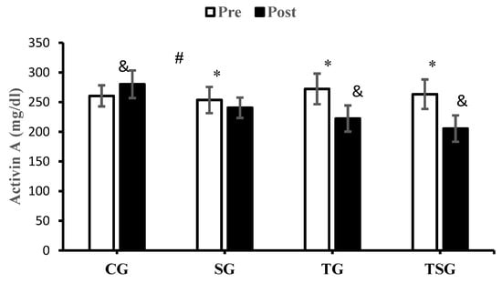The mean ± standard deviation (SD) values of activin A before and after the training. * shows significant differences with the control group (p < 0.05). & indicates significant differences with the pretest values (p < 0.05). # discloses significant interaction between time and group (p < 0.05). Control (CG), supplement (SG), training (TG), and training+ supplement (TSG) groups.