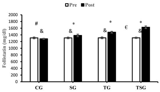 The mean ± standard deviation (SD) values for follistatin before and after the training. * indicates significant differences with the control group (p < 0.05). & shows significant differences with the pretest values (p < 0.05). # discloses significant interaction between time and group (p < 0.05). € depicts significant interaction between time and group (p < 0.05). Control (CG), supplement (SG), training (TG), and training+ supplement (TSG) groups.