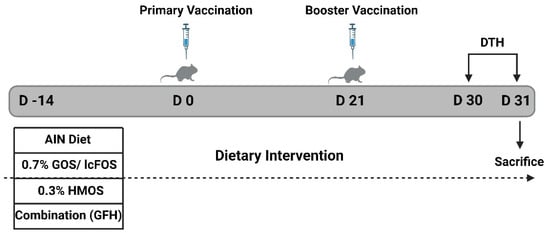 The dietary intervention started two weeks before the primary vaccination, on the animals’ arrival day (day −14). Mice were given the control diet (AIN93G), or control diet supplemented with 0.7% GOS/lcFOS (9:1 ratio), 0.3% HMOS, or their combination (GFH) until the end of the experiment (day 31) (Figure 1). Mice received a primary vaccination on day 0 using influvac (Abbott Biologicals B.V., Weesp, The Netherlands) from season 2019/2020 by subcutaneous (s.c.) injection of 125 μL of vaccine as depicted in Figure 1. influvac is an inactivated influenza virus vaccine that uses isolated hemagglutinin (HA) and neuraminidase antigens from three strains of influenza virus, with a dose of 30 μg/mL HA per strain resulting in a total of 90 μg/mL HA. A booster vaccination was administered 21 days after the primary vaccination. Sham-treated (control) mice received s.c. injections of 125 μL PBS instead of influvac. Nine days after the booster vaccination, antigen-specific delayed-type hypersensitivity (DTH) was induced on day 30 and measured based on ear swelling under deep isoflurane anesthesia after 24 h (day 31).