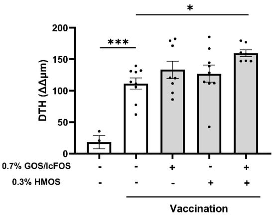 Analysis of the ear thickness measurements after influvac injection demonstrated a significant increase in DTH values in the vaccinated mice compared to the sham-treated controls (Figure 2). Compared to the vaccination group, no significant changes in DTH were detected in vaccinated mice that received diets containing either 0.7% GOS/lcFOS or 0.3% HMOS alone. However, the ear thickness was significantly higher in mice given the diet containing the GFH (p < 0.05).