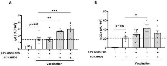 All vaccinated mice showed higher sera levels of influvac-specific IgG1 and IgG2a compared to the non-vaccinated group. Compared to the vaccination group fed a control diet, no significant changes were observed in influvac-specific IgG1 and IgG2a in vaccinated mice fed a diet containing 0.7% GOS/lcFOS alone. However, in vaccinated mice fed a diet with 0.3% HMOS alone or in combination with 0.7% GOS/lcFOS (GFH), serum concentrations of IgG1 were significantly higher (p < 0.001) (Figure 3A). Vaccinated mice that received 0.3% HMOS showed significantly (p < 0.05) increased serum IgG2a concentration levels as compared to the vaccination group fed a control diet. However, the combined intervention GFH did not significantly affect the serum IgG2a levels (Figure 3B).