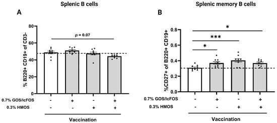 Effect of dietary GOS/lcFOS, HMOS, or their combination (GFH) on splenic B and memory B cells in vaccinated mice. (A) Percentage of splenic B cells (B220+ CD19+ of CD3− cells) among experimental groups and (B) percentage of splenic memory B cells (CD27+ of B220+ CD19+) among experimental groups assessed by flow cytometry. Data are shown based on mean ± SEM. * p < 0.05 and *** p < 0.001. n = 9.