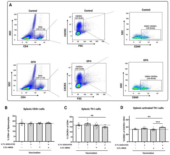 Effect of dietary GOS/lcFOS, HMOS, or their combination (GFH) on frequency and activation status of splenic Th1 cells in vaccinated mice. (A) Representative dot plots of splenic Th1 cells in vaccinated (control) mice with and without GFH intervention assessed by flow cytometry, (B) percentage of CD4+ cells of splenocytes, (C) percentage of CXCR3+ (Th1) cells of CD4+ cells, and (D) percentage of activated splenic Th1 cells (CD69+ of CXCR3+ CD4+ cells). Data are shown based on mean ± SEM. ** p < 0.01 and *** p < 0.001, ns = non-significant. n = 9.