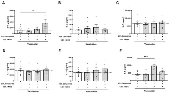 Vaccine-specific cytokine production of splenocytes-DCs co-culture using influenza-loaded bone marrow-derived dendritic cells (BMDCs). Influenza-loaded BMDCs were co-cultured with splenocytes (at a ratio of 1:10 for 5 days) from vaccinated mice with and without a dietary GOS/lcFOS, HMOS, or the combination (GFH) intervention. Co-culture supernatants were collected on day 5 and different cytokines were measured. (A) IFN-γ and (B) interleukin (IL)-2 as Th1-related cytokines, (C) IL-5 and (D) IL-13 as Th2-related cytokines, (E) IL-10 as Treg-related anti-inflammatory cytokine, and (F) pro-inflammatory IL-6. All the cytokines were measured by a ProcartaPlex multiple protein assay. Data are presented as mean ± SEM. * p < 0.05 and *** p < 0.001. (A) Positive control: n = 8, 0.7% GOS/lcFOS: n = 8, 0.3% HMOS: n = 8, and 0.7% GOS/lcFOS + 0.3% HMOS: n = 8, (B) Positive control: n = 9, 0.7% GOS/lcFOS: n = 9, 0.3% HMOS: n = 9, and 0.7% GOS/lcFOS + 0.3% HMOS: n = 8, (C) n = 9, (D) n = 9, (E) Positive control: n = 8, 0.7% GOS/lcFOS: n = 9, 0.3% HMOS: n = 9, and 0.7% GOS/lcFOS + 0.3% HMOS: n = 8, and (F) Positive control: n = 8, 0.7% GOS/lcFOS: n = 9, 0.3% HMOS: n = 8, and 0.7% GOS/lcFOS + 0.3% HMOS: n = 9.