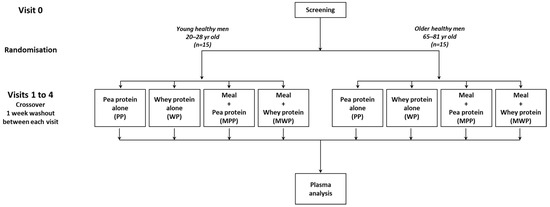 - van Dam, L.; Kardinaal, A.; Troupin, J.; Boulier, A.; Hiolle, M.; Wehrens, R.; Mensink, M. Postprandial amino acid response after the ingestion of pea protein, milk protein, casein and a casein-pea blend, in healthy older adults. Int. J. Food Sci. Nutr. 2024, 75, 70–80. [Google Scholar] [CrossRef] [PubMed]