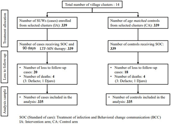 We conducted our intervention in this study at the village level, and therefore those villages are named as the intervention villages. In the intervention villages, we targeted severely underweight children (SUW) as the intervention arm for treatment by LTF-MN to know its impact. In the same intervention villages, we selected reference arm non-SUW children, age-matched (±2 weeks), as controls.