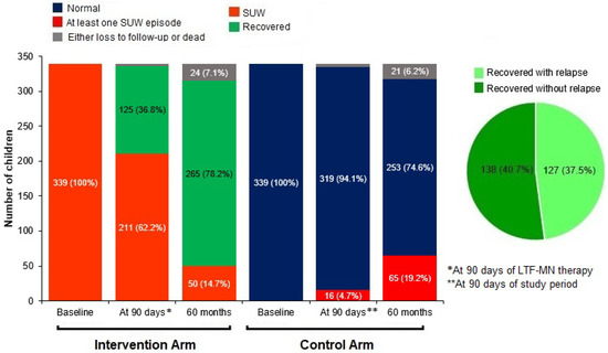 Recovery of SUW children (WAZ > −3) after 90 days of therapy was 36.8%, which improved by 41.4% (95% CI: 34.2%, 48.4%) and became 78.2% at the age of 60 months. The proportion of non recovered SUW children from the intervention arm (14.7%) was less than the proportion of converted SUW children from non-SUW children in the reference arm (19.2%), at the age of 60 months. (p = 0.152), as shown in Figure 2.