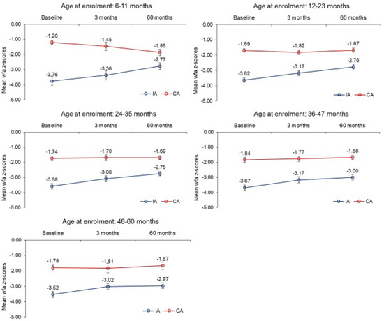A comparison of WAZ scores was conducted in the intervention arm and the reference arm. The estimated marginal means for change in z–scores in the two groups, after adjusting for age at enrollment, and fixed factors like gender, birth weight, parent literacy, and wealth index, as shown in Table 2, were calculated. The mean change in the intervention arm from baseline to 3 months, was positive, suggesting an improvement in the health status and being significantly better than the reference arm (p < 0.05). Estimated marginal means for change in z–scores from baseline to 60 months of age in the intervention arm had a positive mean change and significantly higher than the reference arm (p < 0.05). The mean differences for the baseline to 60 months were higher than the baseline to 3 months. The profiles of raw mean WAZ scores in two arms at baseline, 3 months, and 60 months of age of children according to age at baseline are given in Figure 3. Improvement was observed in the intervention arm across time in all the age categories as compared to the reference arm.
