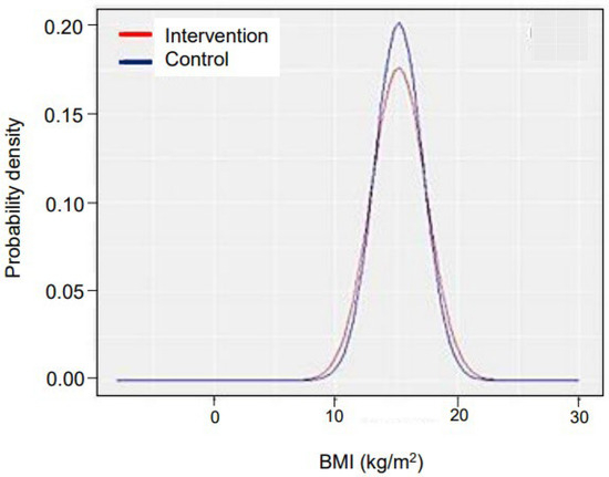 Follow-up was conducted until early adolescence (October 2023), to understand the long-term impact on survival and anthropometry. All children were successfully tracked for survival. Sixty-five children from the intervention arm and 142 children from CA went to other villages; hence anthropometry could not be performed. There was no difference in case fatality rates in both groups (1.17%). The difference in mean BMI and the proportion of mortality between the two groups was not significant (p = 0.952 and p = 0.999, respectively). The probability density of BMI followed a normal distribution in both groups, as revealed in Figure 6. The follow-up of treated SUW children revealed that they achieved growth patterns and BMIs similar to those of normal adolescents, thus, indicating a sustained positive impact of our intervention.