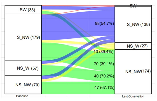The alluvial plot displaying the transition of SUW children as regards severe stunting (S) and severe wasting (W) from baseline to 60 months of age. (NW: not severely wasted, NS: not severely stunted).
