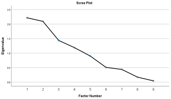 The EFA included nine items from n = 249 adults (55.7 ± 11.3 years; 74.7% female) with obesity (BMI 38.5 ± 6.7 kg/m2). See Table 3 for descriptive statistics and Table 4 for model fit statistics. The scree plot produced after the first round of dimension reduction suggested there were four factors with eigenvalues > 1.0 that explained 77.1% of the variance (Figure 1). Items that did not factor load (coefficients < 0.60) were removed one at a time and replaced back into the model so that every combination of items was tested. Items were removed if their exclusion produced a more parsimonious model with greater explained variance. The following items were removed in order: A1c, BF%, and HDL-C. The final factor solution included three factors explaining 87.6% of the variance as shown in Figure 2 and Table 5. LDL-C and TC loaded on factor one, BMI and WC loaded on factor two, and SBP and DBP loaded on factor three.