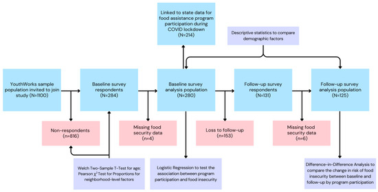 A total of 284 adolescents participated in the baseline survey, of whom 131 participated in the follow-up survey (retention rate: 46%). Adolescents who completed the baseline survey were compared with adolescents who did not (n = 816) using a Welch two-sample t-test on age and neighborhood-level characteristics based on addresses (% of children living below poverty line, % of families receiving TANF, % of families receiving SNAP, and unemployment rate). No significant differences were observed, with the exception of age, in which adolescents who completed the baseline survey were significantly older compared to those who did not, p < 0.05). A small number of individuals were also excluded from analyses due to missing food insecurity data (baseline: n = 4; follow-up: n = 6). Of the 280 adolescents who completed baseline surveys, most were female and categorized as older adolescents (ages 16–19 years). The majority self-identified as Black (over 90%) and reported being unemployed in both surveys. Most participants reported living in households with greater than four members (60%). The prevalence of food insecurity was high: nearly half the sample was classified as food-insecure at baseline (48%; Table 1). Although there were few statistically significant differences between adolescents classified as food-insecure versus food-secure, adolescents had a lower risk of experiencing food insecurity at baseline if they lived in a smaller household (less than four people) (X2[1] = 4.71, p = 0.03) and were younger than 18 (X2[1] = 3.87, p = 0.05). Working at least part-time (X2[1] = 2.41, p = 0.12), identifying as male versus female (X2[1] = 1.73, p = 0.19), and identifying as Black versus other race (X2[1] = 0.16, p = 0.69) did not have a statistically significant association with food insecurity. Participants lost to attrition were similar demographically to those who were retained at follow-up, although participants lost to attrition were slightly more likely to be classified as food-insecure and be unemployed (Supplemental Table S2). A schematic diagram with an overview of the study workflow and sampling can be found in Figure 1.