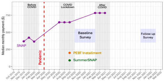 The overall median monthly payments among all federal nutrition assistance programs increased significantly from USD 421 a month pre-pandemic to USD 646 a month pre-baseline survey and then USD 728 a month in the pre-follow-up survey (p < 0.01) (Figure 2). All participants lived in households that were eligible for the SNAP program at the time of the study and had participated in the program at some point. Examining the amounts by program, we observed that monthly median SNAP benefits received by households in our study increased from USD 408 prior to the COVID-19 pandemic to USD 782 in the pre-follow-up time point. Nearly 80% of the sample received a P-EBT installment of USD 199, and 38% received a one-time Summer SNAP payment of USD 90. For both P-EBT and Summer SNAP, payments were distributed to families during the lockdown time point.