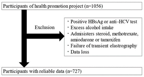 Individuals with the following factors affecting the diagnosis of hepatic steatosis were excluded: patients positive for HBs antigen or HCV antibodies, habitual drinkers (≥30 g/day for men and ≥20 g/day for women), patients taking medications known to cause hepatic steatosis (steroids, methotrexate, amiodarone, and tamoxifen), patients with fewer than 10 Fibroscan measurements, and patients with an interquartile range/median ratio exceeding 0.30, as these were considered unreliable [].