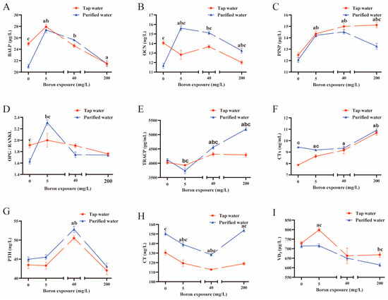 Effects of drinking two types of water with boron on serum biomarkers and regulators bone remodeling (A–F) and calcium regulatory hormones (G–I) of mice. (A) Serum bone alkaline phosphate concentration. (B) Osteocalcin concentration. (C) Procollagen I N-terminal propeptide concentration. (D) The ratio osteoprotegerin and receptor activator of nuclear factor-κB ligand. (E) Tartrate-resistant acid phosphatase concentration. (F) The C-terminal peptide of type I collagen concentration. (G) Parathyroid hormone concentration. (H) Calcitonin concentration. (I) Vitamin D3 concentration. The values are presented as means with the error bars indicating SEM; n = 8 mice/group. a: there is a significant difference compared with the group drinking tap water without boron exposure (p < 0.05). b: there is a significant difference compared with the group drinking purified water without boron exposure (p < 0.05). c: there is a significant difference between the two groups which had the same exposed dose of boron but combined with different water (p < 0.05).