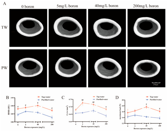 The variation in the impact of boron on bone metabolism, when consuming different water, may lead to differences in bone microstructure. In the mice drinking tap water, low-dose boron exposure (5 mg/L or 40 mg/L) demonstrated beneficial effects on bone structure by enhancing the vertebral BV/TV, Tb.N, and femoral Tt.Ar, while concurrently reducing the Tb.Pf, Tb.Pf, and SMI of the vertebrae. The advantageous effects on the vertebral Tb.Pf, SMI, and femoral Tt.Ar were attenuated as the boron exposure increased (200 mg/L). All of these benefits of boron were negated at some exposure doses in the mice drinking purified water. Differences in bone microstructure may result in differences in bone biomechanics. Maximum load is a critical indicator of bone strength [16,41,42,43,44]. The maximum load of the femora in the mice drinking purified water was lower than that in the mice drinking tap water when exposed to 40 mg/L and 200 mg/L. Consequently, we hypothesize that the low mineral content in drinking water may attenuate the benefits of boron on bone microstructure and biomechanics. This attenuation may be attributed to the influence of boron’s regulatory capacity on bone metabolism.