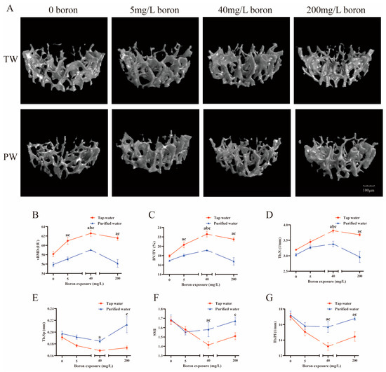 In the groups drinking purified water, the vertebral BV/TV (Figure 3C), Tb.N (Figure 3D), and BMD (Figure 3B) significantly increased when co-exposed to 40 mg/L boron (p < 0.05). In the groups drinking tap water, the vertebral Tb.Sp decreased in the group exposed to 40 mg/L boron (p < 0.05, Figure 3E). The femora Ct.Ar significantly increased in the groups exposed to 5 mg/L and 40 mg/L boron (p < 0.05, Figure 2C). When co-exposed to 40 mg/L and 200 mg/L boron, the vertebral Tb.N (Figure 3D) increased and Tb.Pf (Figure 3G) decreased (p < 0.05). The vertebral BV/TV (Figure 3C) and BMD (Figure 3B) increased across all the boron-exposed groups (p < 0.05).