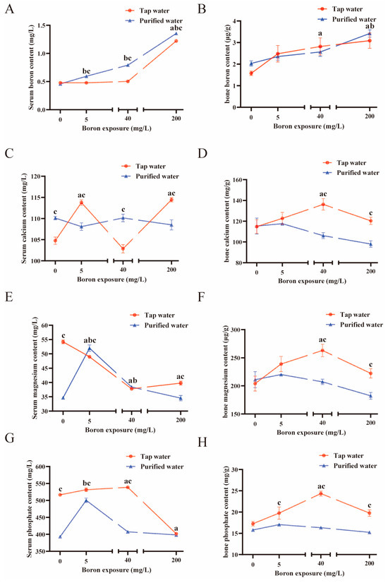 Except for bone boron, drinking water type and boron exposure had interaction effects in regulating serum and bone minerals (p < 0.05). The mice drinking purified water compared to those drinking tap water, exhibited higher serum boron and lower bone phosphate in all the groups co-exposed to boron (p < 0.05, Figure 4A,H), and had lower bone calcium and magnesium when co-exposed to 40 mg/L and 200 mg/L boron (p < 0.05, Figure 4D,F), and lower serum phosphate when co-exposed to 0 mg/L, 5 mg/L, and 40 mg/L boron (p < 0.05, Figure 4G). The serum magnesium in the mice drinking purified water decreased when co-exposed to 0 mg/L and 200 mg/L boron but increased when co-exposed to 5 mg/L boron (p < 0.05, Figure 4E), and serum calcium increased when co-exposed to 0 mg/L and 40 mg/L boron but decreased when co-exposed to 5 mg/L and 200 mg/L boron (p < 0.05, Figure 4C) compared to those in mice drinking tap water.
