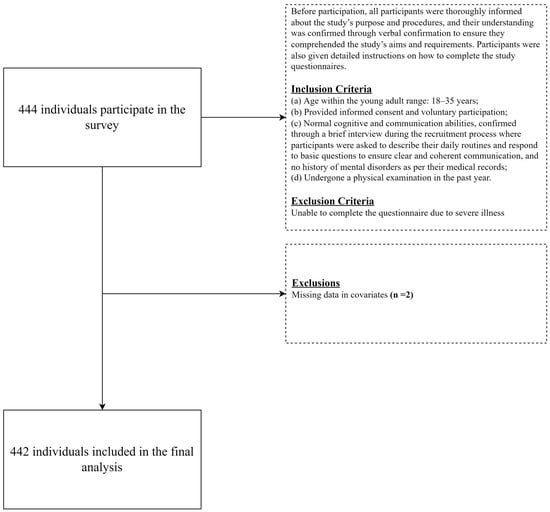 Participants were recruited using a convenience sampling method from a tertiary hospital’s health management center in Tianjin, China, from September 2022 to March 2023. Inclusion criteria were as follows: (a) age within the young adult range: 18–35 years; (b) provided informed consent and voluntary participation; (c) normal cognitive and communication abilities, confirmed through a brief interview during the recruitment process where participants were asked to describe their daily routines and respond to basic questions to ensure clear and coherent communication, and no history of mental disorders as per their medical records; (d) underwent a physical examination in the past year. Exclusion criteria included the inability to complete the questionnaire due to severe illness. Before participation, all participants were thoroughly informed about the study’s purpose and procedures, and their understanding was confirmed through verbal confirmation to ensure they comprehended the study’s aims and requirements. Participants were also given detailed instructions on how to complete the study questionnaires. Each questionnaire took approximately 25–30 min to complete. A total of 442 samples were included in this study (Figure 1).