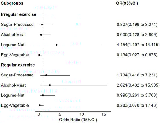 As shown in Figure 2, within the irregular physical activity group, participants in the top quartile of the Legume–Nut pattern scores had greater OR for metabolic syndrome (OR = 4.15; 95%CI: 1.20–14.42; p = 0.025) than those in the bottom quartile. Compared with those in the bottom quartile, participants in the top quartile of the Egg–Vegetable pattern scores had a lower OR for metabolic syndrome (OR = 0.13; 95%CI: 0.03–0.68; p = 0.015). In addition, no significant association was observed between Sugar–Processed and Alcohol–Meat patterns and metabolic syndrome (p > 0.05). In the regular physical activity group, no significant association was observed between dietary patterns and metabolic syndrome (p > 0.05).
