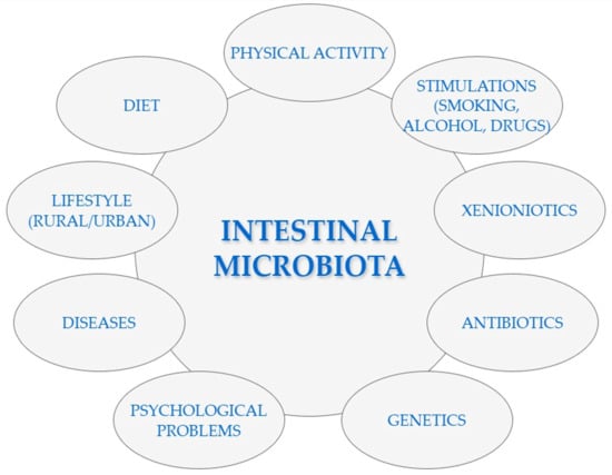 The concept of the “microbiota-gut-brain axis” has been developed to describe the influence of human gut microbiota on homeostasis via the gut–brain axis [33]. Moreover, experimental results have shown that gut microbiota disorders are associated with the modulation of neuronal functions and brain metabolites [34,35]. The functioning of the microbiota depends on disturbed or normal intestinal physiology [36,37,38]. In turn, an imbalance in the intestinal microbiota, known as intestinal dysbiosis, may be caused by, for example, an inappropriate diet or too many pathogens. A weakened mental condition, which may be caused by long-term stress, may also contribute to a change in the intestinal microbiota composition [36,39,40,41].