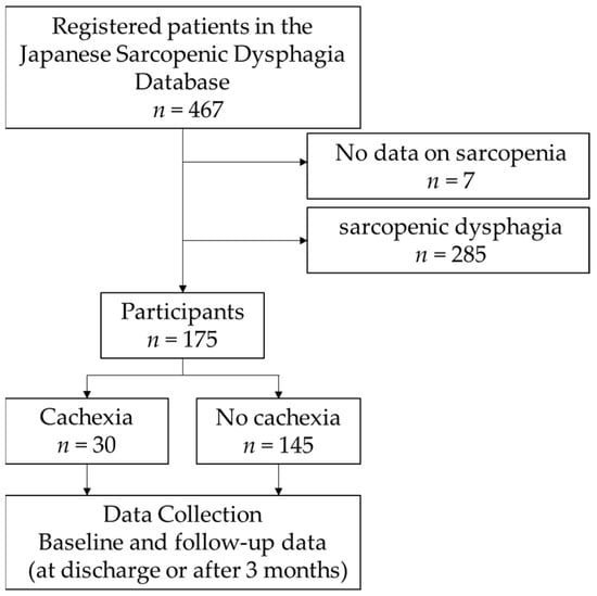 - Wakabayashi, H.; Kakehi, S.; Mizuno, S.; Kinoshita, T.; Toga, S.; Ohtsu, M.; Nishioka, S.; Momosaki, R. Prevalence and prognosis of cachexia according to the Asian Working Group for Cachexia criteria in sarcopenic dysphagia: A retrospective cohort study. Nutrition 2024, 122, 112385. [Google Scholar] [CrossRef] [PubMed]