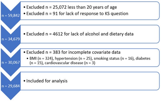 NHANES is an ongoing program of nationally representative cross-sectional health surveys and physical examinations of adults and children in the US. The program has been conducted continuously in two-year cycles since 1999. The survey component collects demographic, socioeconomic, dietary, and health-related information. The examination component, conducted by trained medical personnel, obtains physiological measurements and data from laboratory testing. A total of 59,842 participants were interviewed for NHANES from 2007 to 2018. Of these, our analysis included 29,684 participants aged 20 years or older with complete data on alcohol intake, history of KS, and the covariates of interest (Figure 1).