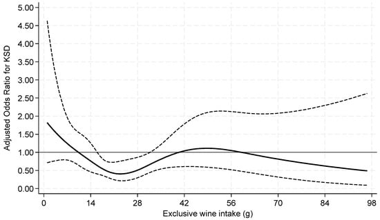 Statistical analysis was performed with Stata MP 18 (Stata Corp, College Station, TX, USA). The complex sampling design was incorporated by applying strata, primary sampling units, and sampling weights via survey-specific procedures. Day one 24 h recall weights were used for all analyses. Logistic regression was used to estimate unadjusted and multivariable-adjusted odds ratios (ORs) and 95% confidence intervals (CIs) for alcohol intake and prevalent KSD. Alcohol intake was examined as both a categorical and a continuous predictor of KS formation. Categories were created from the type of alcohol consumed and, within each type, from amounts reflecting the ratios of a standard drink (14 g) []. Alcohol intake of each type was also examined by including restricted cubic splines in the regression model []. Knots were specified at the 5th, 25th, 50th, 75th, and 95th percentiles of the distribution among participants drinking at least 1 g of a specific type of alcohol. A binary indicator variable was added to the model to represent 0 to less than 1 g of alcohol []. Deviations from linearity were assessed by testing coefficients for non-linear spline terms. The multivariable models included age (years), sex, race (non-Hispanic White, non-Hispanic Black, Hispanic/Latino, non-Hispanic other), BMI (<25, 25–<30, >30 kg/m2), diabetes (no, borderline/yes), hypertension, thiazide diuretic use, smoking (never, former, current), total dietary calories (kcal), total dietary protein (g), total fluid without alcohol contribution (g), dietary sodium (mg), potassium (mg), and calcium (mg). All p-values presented were two-tailed, with p < 0.05 considered statistically significant.