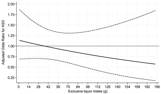 Exclusive liquor consumption was not associated with prevalent KS when analyzed as a categorical or continuous variable (Table 5 and Figure 4).