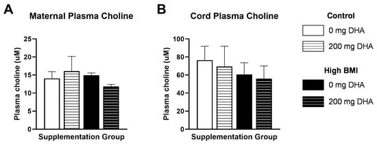(A) Maternal and (B) cord plasma choline concentrations. No differences between any groups via two-way ANOVA with Tukey’s adjustment.
