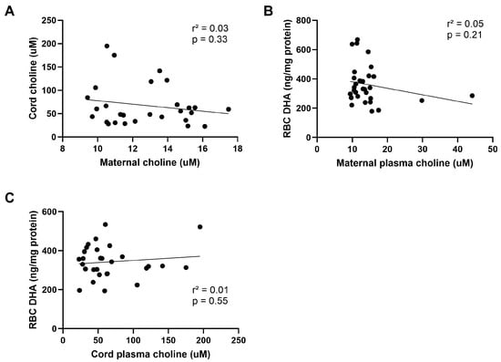 Correlations of (A) maternal and cord plasma choline, (B) Maternal RBC DHA and maternal plasma choline, and (C) Cord RBC DHA and cord plasma choline. Data were analyzed using Pearson’s correlation.