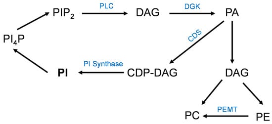 Phosphatidylinositol pathway showing PI is sequentially metabolized into phosphoinositol-4-phosphate (PI4P) and phosphatidylinositol 4,5-bisphosphate (PIP2). PIP2 can be converted by phospholipase C (PLC) into diacylglycerol (DAG), which is acted upon by diacyglycerol kinase (DGK) to form phosphatidic acid (PA), which can be used for the generation of PI, PC, and PE phospholipids.