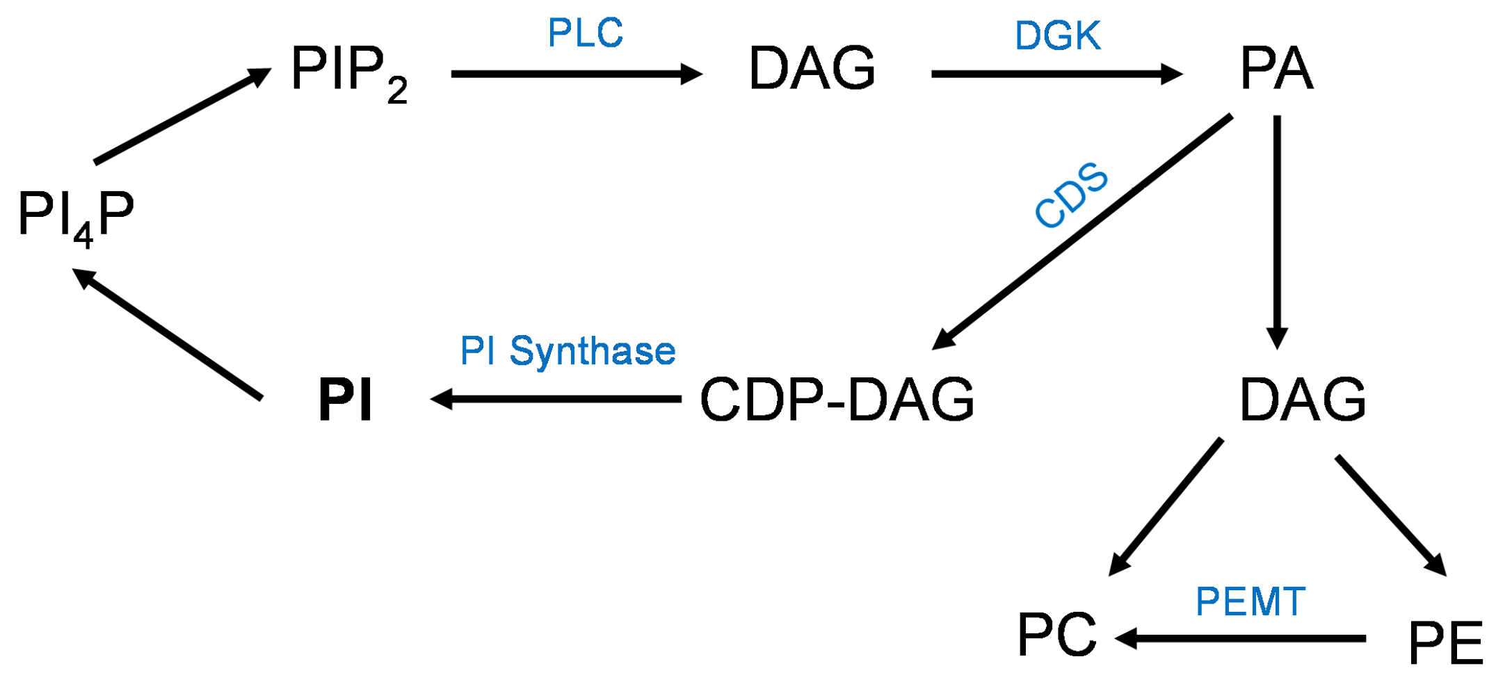 - Epand, R.M. Features of the Phosphatidylinositol Cycle and its Role in Signal Transduction. J. Membr. Biol. 2017, 250, 353–366. [Google Scholar] [CrossRef] [PubMed]