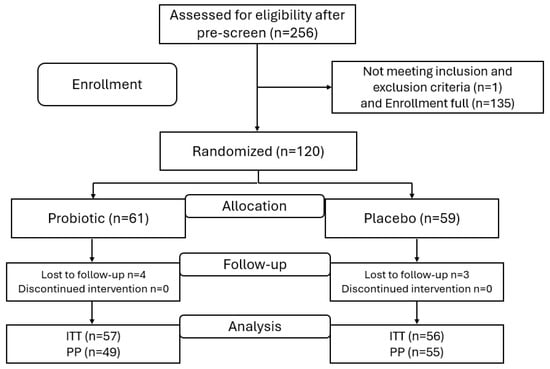 This study consisted of a probiotic arm (n = 59) and a placebo arm (n = 61). The intent-to-treat (ITT) population included all randomized participants (n = 120) (Figure 1). The per protocol (PP) population is a subset of the ITT that completed the study in full compliance (n = 104). The reasons for exclusion from the PP were (i) product non-compliance (n = 8) and (ii) not completing the OHQ questionnaire (n = 8). The participants’ characteristics are detailed in Table 1.