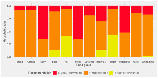 When analyzing the intake of different food groups among Chilean vulnerable households according to the “recommendation” categories, it was possible to highlight different tendencies (Table S1) all shown schematized in Figure 1. First, it was found that recommended intake of food groups such as bread, cereals, eggs, legumes, sugar, water, and white meats were each met or exceeded by at least 75% of the households. Secondly, not all food groups had intakes in the “above recommended” category; these food groups included vegetables, fruits, dairy and water. In addition, only in the case of vegetables, fruits and dairy, there were more households with “below recommended” intake in comparison to those with “recommended” and “above recommended” intake. Finally, the only food groups that were regularly overconsumed were fats and sugars.