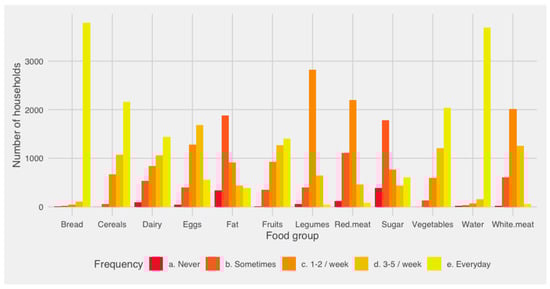 However, the above describe the proportion of households within each recommendation category and do not give any detail regarding the frequency of intake for the different food groups. Thus, Figure 2 shows this information according to the intake frequency detailed in Supplementary Material. One of the main findings in this analysis is related to the intake of bread, which is consumed daily by 92% of households. It was also found that nearly half of the households consumed vegetables and cereals on a daily basis. Also, fats and sugar were consumed at least once a week by all households. Most households consumed protein at least once per week, mainly through white meat and/or legumes. Finally, most members of households consumed water daily.