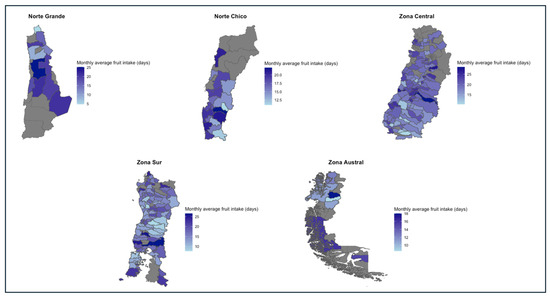 The highest averages for fruit consumption were found in the Zona Central (19.8 ± 10.1) and Norte Chico (18.0 ± 9.7), whereas the lowest were found in the Zona Sur (16.3 ± 10.2) and the Zona Austral (15.9 ± 9.4). Although there was a difference of almost 4 days per month between the macro-zones with the highest and lowest intake, it was found that all macro-zones had, on average, an intake of once every two days. All macro-zones showed a daily intake of fruits in at least one of their communes. However, n = 8 communes in the Zona Central (0.48%), n = 4 (0.2%) communes in the Zona Sur, and n = 5 (5.1%) communes in the Zona Austral showed no intake of fruit during the month. Finally, whereas a daily intake of fruits was found as the more frequent value in the Norte Grande and Zona Central, in the Zona Austral, the most repeated value, representing 28% of the households, was an intake of 6.4 days/month. Regarding the number of households below the recommended fruit intake, the southern macro-zones showed the highest values, with the Zona Austral (n = 81) reaching 82.6% of households under that condition, and Zona Sur (n = 1290) 78.1% of households under the same classification. Details about the values of these indicators for each region and the spatial representation of these differences can be found in Table 10 and Figure 5, respectively.