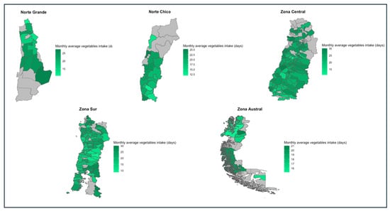 The Zona Central (23.81 ± 8.8) and Norte Grande (21.2 ± 9.5) were the macro-zones with the highest monthly average intake of vegetables per household, whereas the Zona Austral (18.1 ± 8.9) and the Norte Chico (19.9 ± 9.8) were the macro-zones with the lowest monthly average intake. All macro-zones had at least one household with an average intake of vegetables of 30 days/month, with the Zona Central (n = 1058; 63.4%) being the macro-zone with the highest number, and the Zona Austral (n = 29; 29.6%) the macro-zone with the lowest. However, it was only in the Zona Sur where we found households (n = 2; 0.1%) with no consumption of vegetables. Finally, except for the Zona Austral, whose most frequent vegetable intake average was 17.1 days/month in n = 38 (39%) of their households, all other macro-zones had a daily intake of vegetables as their most frequent value, compared to the other intake frequencies. As with fruit intake, the southern macro-zones were those with the greatest proportion of households in the “below recommended” category (Zona Sur: n = 1128 (63.5%); Zona Austral n = 69 (70.4%)). Details about the values of these indicators for each region and the spatial representation of these differences can be found in Table 11 and Figure 6, respectively.