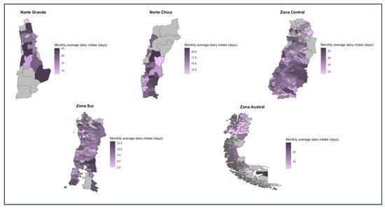 The highest averages for dairy intake per household were found in the Norte Grande (19.2 ± 10.8) and the Zona Central (18.5 ± 10.9), whereas the lowest averages were in the Zona Austral (15.9 ± 11) and the Zona Sur. All macro-zones had at least one household that showed a daily intake of dairy products, with the Norte Grande (44%) and the Zona Central (41.8%) being those with a major proportion. However, all macro-zones had a daily intake of dairy products as their most frequent value. In addition, at least one household in all macro-zones showed a zero intake of dairy products within the monthly period, most commonly in the Zona Central (n = 51; 3.05%) and the Zona Austral (n = 5; 5.1%). For this food group, 72.3% (n = 1284), of Zona Sur households were below the recommended intake of dairy products, whereas 69.4% (n = 68) of households in the Zona Austral fell into this classification. Details about the values of these indicators for each region and the spatial representation of these differences can be found in Table 12 and Figure 7, respectively.