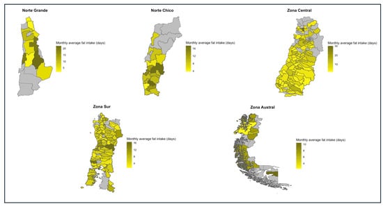 The Norte Grande (9.8 ± 10.7) and the Norte Chico (10.5 ± 10.2) were the macro-zones with the highest average intake of fat. All macro-zones had at least one household with a daily intake of fat: the Norte Grande (n = 31; 17.4%) and the Norte Chico (n = 46; 15.4%) had the highest values. Similarly, all macro-zones showed at least one household with no intake of fat at all. Of these, the Norte Grande (n = 21; 11.8%) and the Zona Austral (n = 10; 10.2%) were the macro-zones with major representation. Finally, the most frequent value for household fat intake across all macro-zones was 2.1 days/month. The northern macro-zone had the highest values regarding the overconsumption of fat. Thus, the Norte Chico presented 56% (n = 167) of households under this classification, whereas the Norte Grande had a rate of 50.6% (n = 90). Details about the values of these indicators for each region and the spatial representation of these differences can be found in Table 13 and Figure 8, respectively.