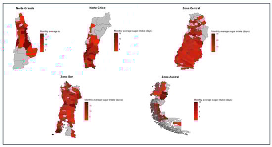The macro-zones with the highest average sugar intake were the Norte Grande (10.5 ± 11.1) and the Zona Central (10.5 ± 11.3). All macro-zones had at least one household with a daily intake of sugar, with the Zona Central (n = 363; 21.8%) and the Norte Grande (n = 36; 20.2%) being those with the highest values. Similarly, all macro-zones included some households with no intake of sugar. In this case, the Zona Austral (n = 11; 11.2%) and the Zona Sur (n = 192; 10.1) had the highest values. For all macro-zones, the most frequent household sugar intake was 2.1 days/month. The Norte Grande (n = 88; 49.4%), Norte Chico (n = 149; 50%), and Zona Central (n = 840; 49.5%) presented the highest rates for households with overconsumption of sugar. Details about the values of these indicators for each region and the spatial representation of these differences can be found in Table 14 and Figure 9, respectively.