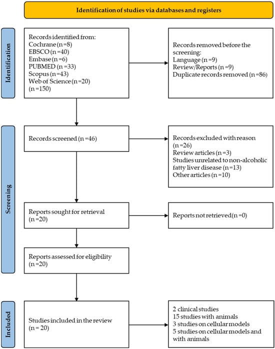 A comprehensive search across multiple databases, including Cochrane, Ebsco, Embase, PubMed, Scopus, and Web of Science, yielded 150 articles. After removing duplicates, 64 articles remained. Of these, 18 were excluded due to being in a language other than English or not being original research. An additional 18 articles were excluded because they did not pertain to NAFLD or failed to meet the inclusion criteria. Finally, 20 articles met the inclusion criteria and were included in the analysis. The characteristics of the included studies are presented in Table 1, Table 2 and Table 3. All studies were published between 2011 and 2024. The selected articles included clinical studies (2), animal studies (15), cell line studies (3), and studies involving both animal and cell line research (5).