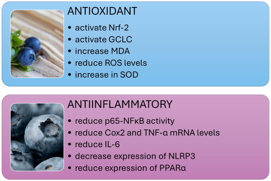 A significant reduction in liver inflammation was observed in studies investigating the effects of a high-cholesterol diet combined with the nutraceutical Mirtoselect (p < 0.001). Mirtoselect did not influence the expression of Emr1 or Ccl2, indicating its anti-inflammatory effect might limit the influx of other immune cells. Additionally, there was no increase in the hepatic gene expression of the neutrophil marker Mpo, suggesting a decrease in neutrophil infiltration. Supporting this, the expression of the neutrophil chemoattractants Cxcl1 and Cxcl2 was also reduced by the high-cholesterol diet and Mirtoselect combination. Moreover, Mirtoselect mitigated the disease-related increase in hepatic free cholesterol. The high-cholesterol diet significantly enhanced TNF-α and IL-1β signaling, which activated the proinflammatory transcription factor NF-κB. There was a positive correlation between liver-free cholesterol levels and p65-NF-κB transcriptional activation, linking cholesterol to inflammation. Conversely, Mirtoselect helped reduce p65-NF-κB activity [72]. Glisan et al. [33] examined the impact of cranberry extract supplementation on liver inflammation in obese C57BL/6J mice on a high-fat diet. They discovered that the dietary inclusion of cranberry extract lowered the hepatic mRNA expression of TNF-α, Ccl3, and Cox2, as well as the hepatic protein levels of CCL2 and TNF-α when compared to mice on a high-fat diet without the extract. The study also revealed that cranberry extract significantly reduced hepatic mRNA levels of Tlr4 and NF-κB. These findings, alongside the decrease in TNF-α protein levels and the reduction in the liver’s Cox2 and TNF-α mRNA levels, indicate that the extract partially mitigates liver inflammation by influencing the TLR4/NF-κB signaling pathway. Ren et al. [76] investigated the impact of blueberry juice on the development of NASH. In this study, qRT-PCR analysis indicated that mRNA levels of IL-6 and TNF-α were lower with dietary supplementation of blueberry juice in laboratory animals. Treatment with blueberry juice reduced the levels of IL-6 and TNF-α. Similar findings were obtained by Haga et al. [74], who investigated extracts from Vaccinium myrtillus L. in a murine model of liver steatosis. The research results demonstrated reduced levels of proinflammatory cytokines TNF-α, IL-9, IL-1β, and IFN-γ. Treatment with cranberry showed a tendency to suppress IL-6 expression, as observed in the study by Shimizu et al. [84]. Cranberry at 50 and 100 mg/kg doses significantly reduced TNF-α levels by 48% and 72%, respectively. Serum levels of IL-6 also significantly decreased by 36% and 73% at doses of 50 and 100 mg/kg, respectively. Cranberry at both doses reduced the activation of NF-κB, which regulates the production of several proinflammatory cytokines, including TNF-α and IL-6 [71]. In the study by Hewage et al. [32], a high-fat diet induced the formation of inflammatory foci in the livers of mice and increased hepatic mRNA levels of IL-6, MCP-1, and TNF-α. Inflammatory foci were not observed in mice supplemented with cranberry. Furthermore, supplementation with cranberry reduced the expression of IL-6, MCP-1, and TNF-α mRNA [80].