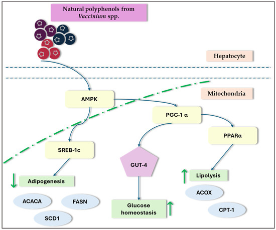 Extracts from Vaccinium species may influence the activity of fatty acid synthase (FAS) and ACC. In vivo, studies demonstrated that a high-fat diet significantly reduced pAMPKα, PGC-1α, and SIRT3 proteins in rat livers, an effect that was effectively countered by the administration of blueberry leaf extracts [35]. In a study on de novo hepatic lipogenesis, the phosphorylation of AMPK was evaluated by measuring the ratio of phosphorylated AMPK (pAMPK) to total AMPK protein levels in the liver. A high-fat diet significantly decreased both pAMPK levels and the pAMPK/AMPK ratio compared to animals on a control diet. However, supplementation with lingonberry restored both pAMPK levels and the pAMPK/AMPK ratio [32].