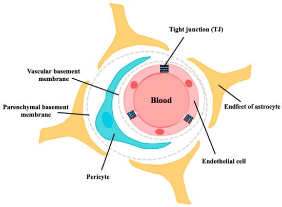 Schematic structure of the BBB. The walls of all brain capillaries consist of a thin monolayer of specialized brain microvascular endothelial cells connected by tight junctions (TJs). These endothelial cells are surrounded by a vascular basement membrane (BM), pericytes, parenchymal BM, and astrocyte endfeet, all of which directly or indirectly contribute to the barrier function of the BBB.