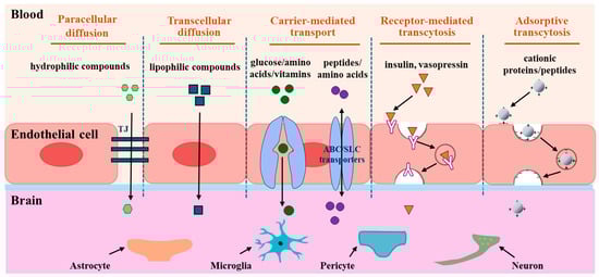 Despite the difficulties associated with substrates crossing the BBB, there are several ways to transport them to the brain. Transportation routes in the BBB involve passive diffusion, carrier-mediated transport, receptor-mediated transcytosis, and adsorption-mediated transcytosis [18] (Figure 2).