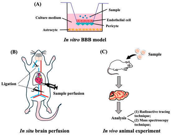 Transportability of peptides across the BBB. (A) Schematic representation of the in vitro reconstituted BBB model. Endothelial cells are seeded on the upper side of the filter, astrocytes are seeded at the bottom of the plates, and pericytes at the filter membranes of inverted cell culture inserts. (B) Representative in situ brain perfusion experiments. After the mice were anesthetized, the descending thoracic aorta was ligated, and at the start of the perfusion, the left jugular was sectioned. After perfusion, the whole brain was removed from the mice and used for detection. (C) Schematic representation of in vivo animal experiments. The mouse or rat is administrated with target peptides, then the brain was collected and finally detected by the radioactive tracing technique or mass spectroscopy techniques.