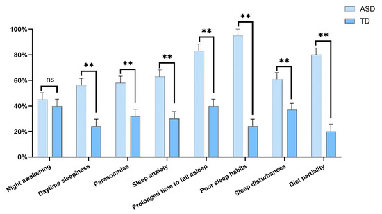 Comparisons of sleep disorders and diet partiality between the ASD and TD groups. ns indicates p > 0.05; ** indicates p < 0.01.