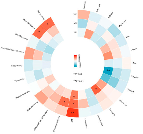 Associations of severity of ASD symptoms with serum nutrient levels, body composition, sleep disorders, and diet partiality. The p-values were adjusted for age, sex, resident type, maternal education, and paternal education.
