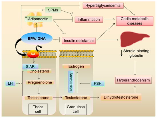 A cross-sectional study of 104 white pre-menopausal women with PCOS from Australia showed that a higher plasma concentration of n-6 PUFA and a higher n-6:n-3 ratio was linked to increased circulating androgens [68]. A subsequent randomized cross-over study of 22 women conducted by the same investigators showed that daily 2.4 g of EPA + DHA supplementation for six weeks significantly reduced plasma bioavailable testosterone levels [68]. Mechanistically, the reduced testosterone in the n-3 PUFA group is likely to be due to a reduced n-6:n-3 ratio leading to reduced availability of AA in cell membranes (Figure 2), since n-6 PUFA treatment was shown to increase androstenedione secretion from bovine theca cells in vitro [68]. Previous studies have shown that AA is important for LH-stimulated steroidogenesis in vitro [82]. This AA effect is at least in part via the regulation of steroidogenic acute regulatory protein (StAR) expression [83]. From the clinical studies, a reduction in serum testosterone was mainly seen with supplementation of fish oil (EPA + DHA) rather than flax seed oil (ALA). As mentioned before, EPA and DHA directly compete with AA for incorporation to cell membranes, while ALA indirectly reduces AA via competing with delta 6 desaturase, the enzyme which converts LA to AA [84]. Thus, fish oil (EPA/DHA) appears to be more effective in reducing serum testosterone in women with PCOS rather than ALA-containing supplements such as flax seed oil.